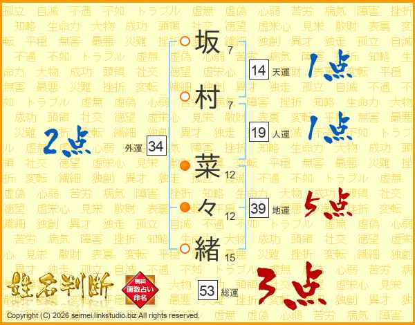 坂(7画)村(7画) 菜(12画)々(12画)緒(15画)