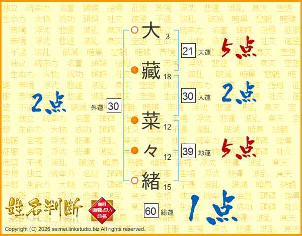 大(3画)藏(18画) 菜(12画)々(12画)緒(15画)