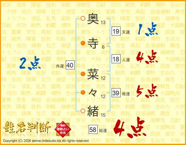 奥(13画)寺(6画) 菜(12画)々(12画)緒(15画)