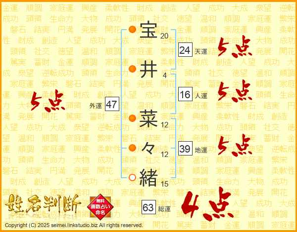 宝(20画)井(4画) 菜(12画)々(12画)緒(15画)