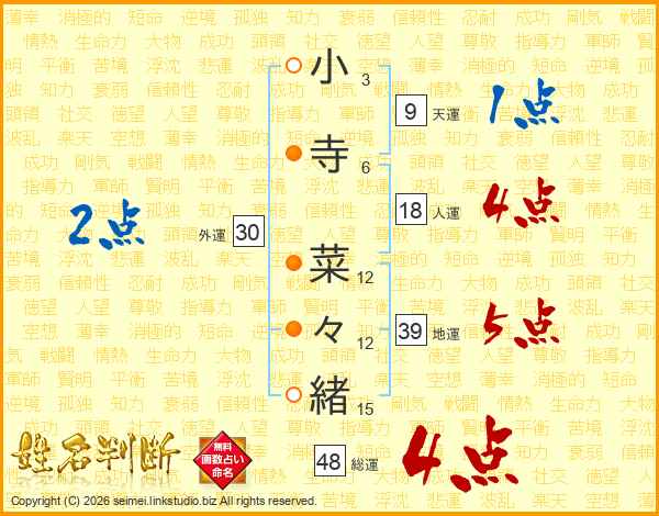 小(3画)寺(6画) 菜(12画)々(12画)緒(15画)