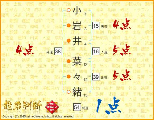 小(3画)岩(8画)井(4画) 菜(12画)々(12画)緒(15画)
