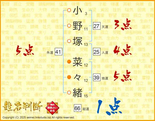 小(3画)野(11画)塚(13画) 菜(12画)々(12画)緒(15画)