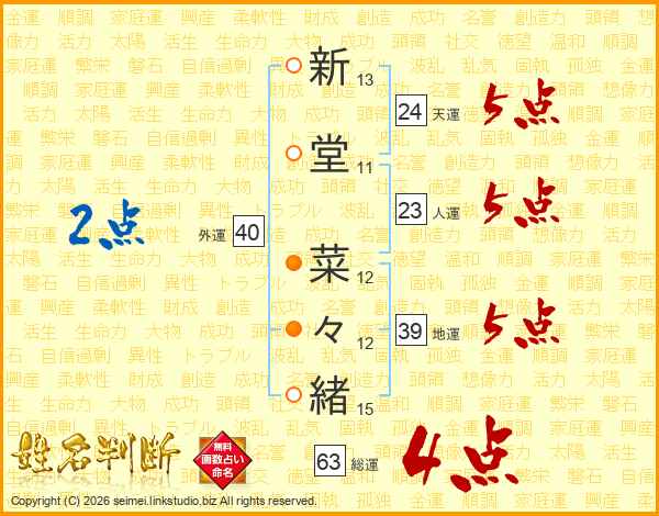新(13画)堂(11画) 菜(12画)々(12画)緒(15画)