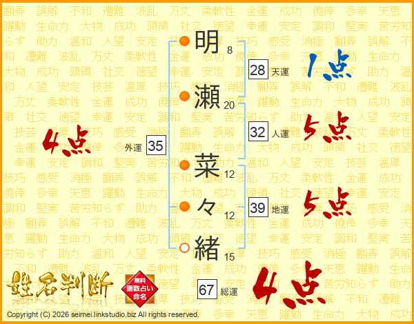 明(8画)瀬(20画) 菜(12画)々(12画)緒(15画)