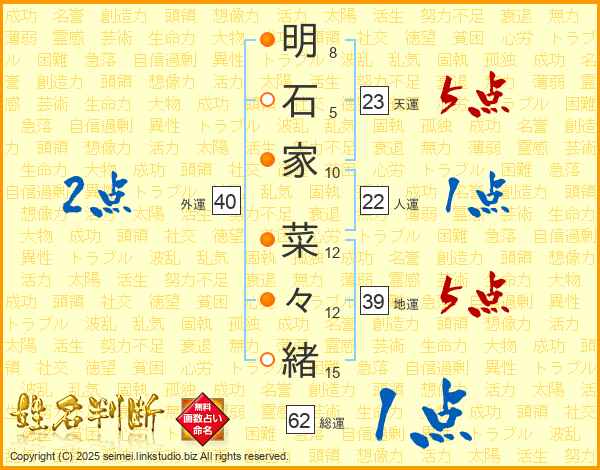 明(8画)石(5画)家(10画) 菜(12画)々(12画)緒(15画)