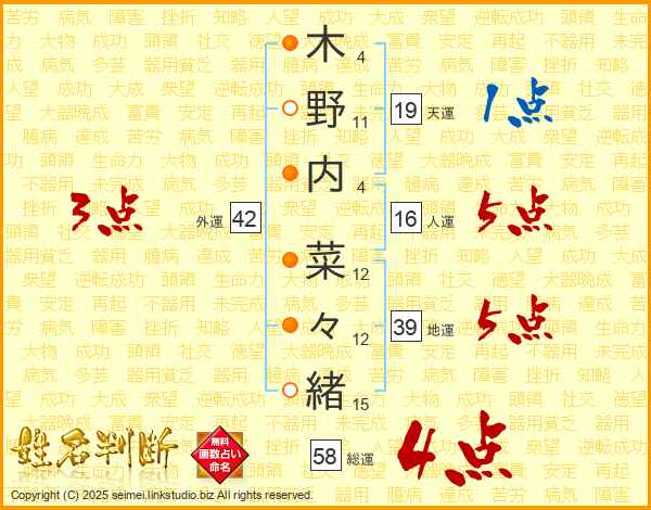 木(4画)野(11画)内(4画) 菜(12画)々(12画)緒(15画)