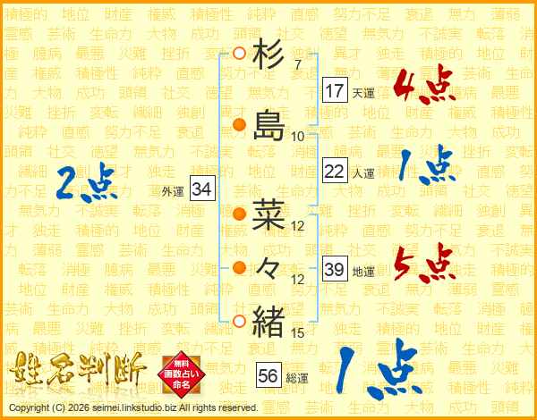 杉(7画)島(10画) 菜(12画)々(12画)緒(15画)