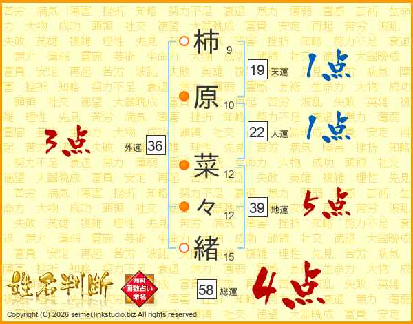 柿原菜々緒さんの総運は58画の4点!