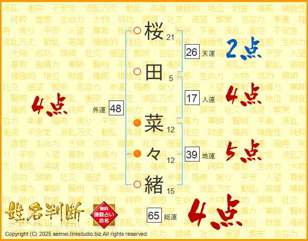 桜(21画)田(5画) 菜(12画)々(12画)緒(15画)