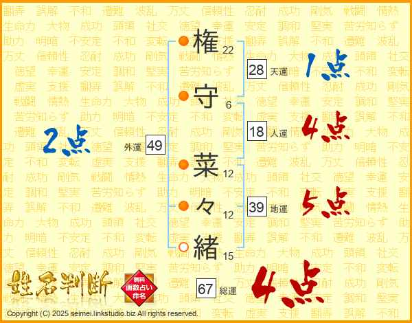 権(22画)守(6画) 菜(12画)々(12画)緒(15画)
