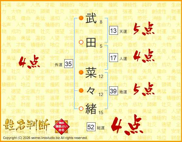 武(8画)田(5画) 菜(12画)々(12画)緒(15画)