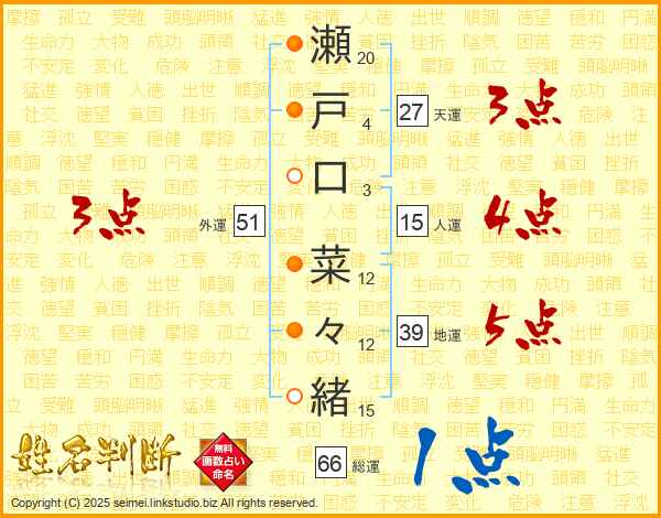 瀬(20画)戸(4画)口(3画) 菜(12画)々(12画)緒(15画)