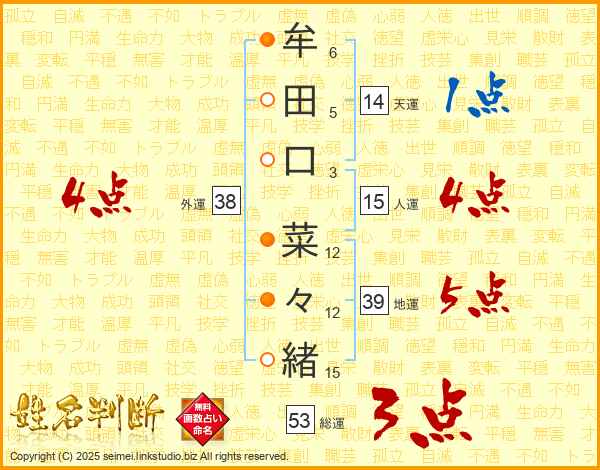 牟(6画)田(5画)口(3画) 菜(12画)々(12画)緒(15画)