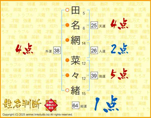 田(5画)名(6画)網(14画) 菜(12画)々(12画)緒(15画)