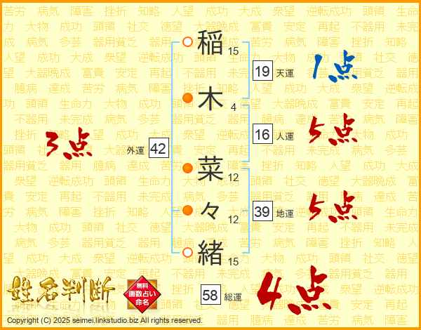 稲(15画)木(4画) 菜(12画)々(12画)緒(15画)