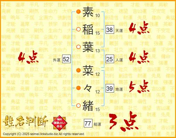 素(10画)稲(15画)葉(13画) 菜(12画)々(12画)緒(15画)