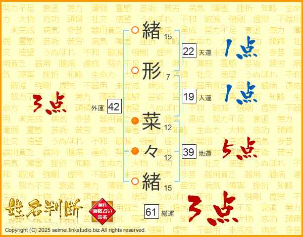 緒(15画)形(7画) 菜(12画)々(12画)緒(15画)