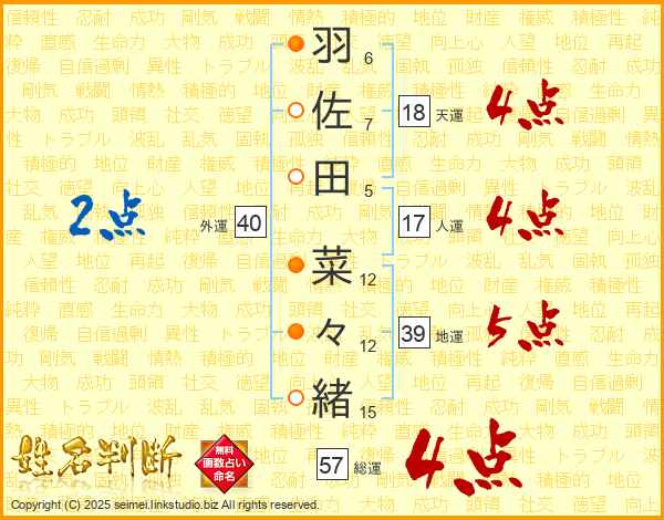 羽(6画)佐(7画)田(5画) 菜(12画)々(12画)緒(15画)