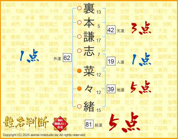 裏本謙志菜々緒さんの総運は81画の5点!