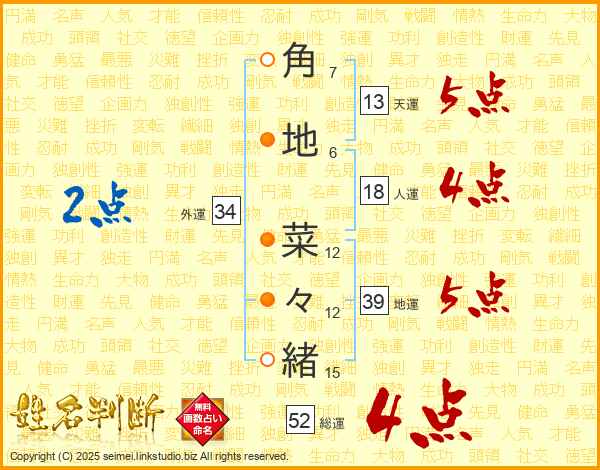 生活面を象徴する運勢です。外部から受ける影響力を表し、結婚運、家庭運や職場、環境への順応性を表します。総運から人運を引いた画数。姓や名が1文字の場合を除く。