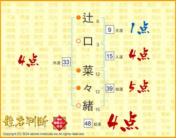 辻(6画)口(3画) 菜(12画)々(12画)緒(15画)