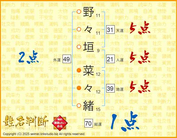 野(11画)々(11画)垣(9画) 菜(12画)々(12画)緒(15画)