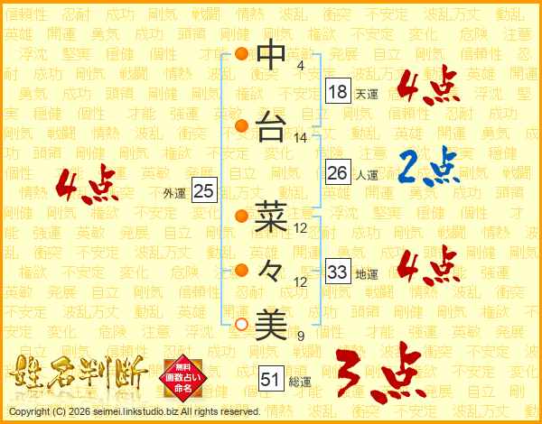 中(4画)台(14画) 菜(12画)々(12画)美(9画)