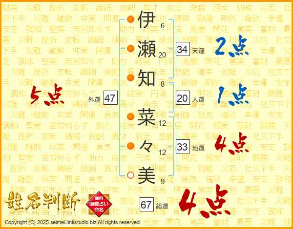 伊(6画)瀬(20画)知(8画) 菜(12画)々(12画)美(9画)