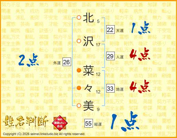 北(5画)沢(17画) 菜(12画)々(12画)美(9画)