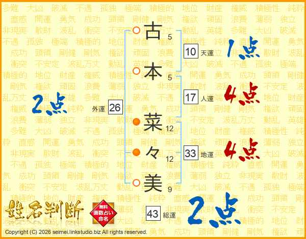 古(5画)本(5画) 菜(12画)々(12画)美(9画)