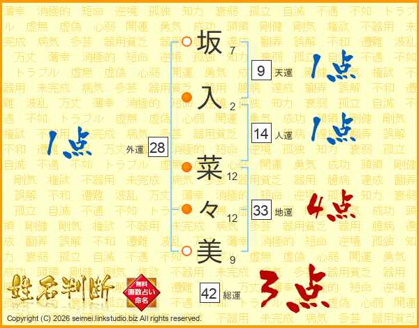 坂(7画)入(2画) 菜(12画)々(12画)美(9画)