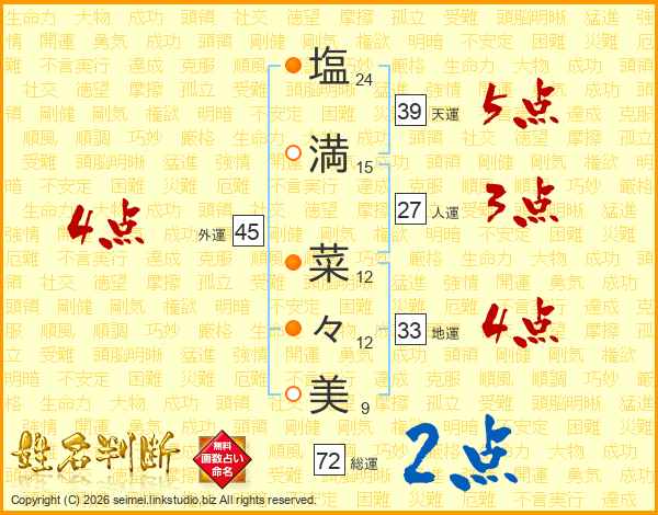 塩(24画)満(15画) 菜(12画)々(12画)美(9画)