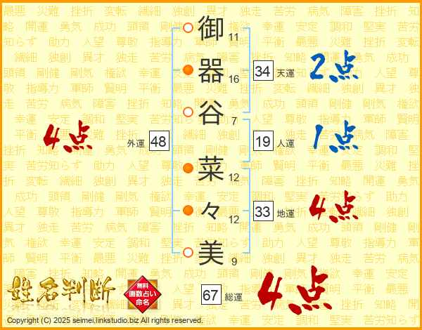 御器谷菜々美さんの総運は67画の4点!