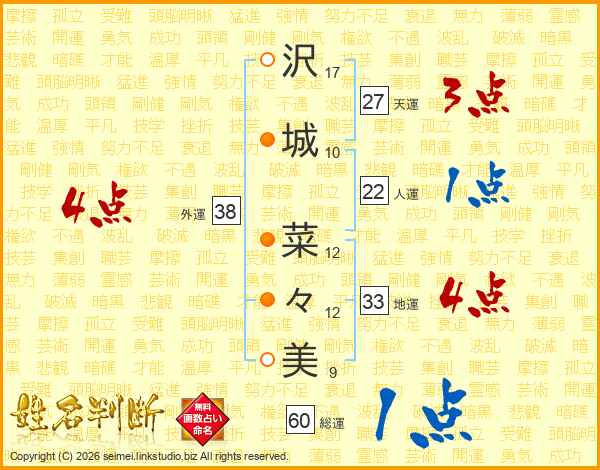 沢(17画)城(10画) 菜(12画)々(12画)美(9画)