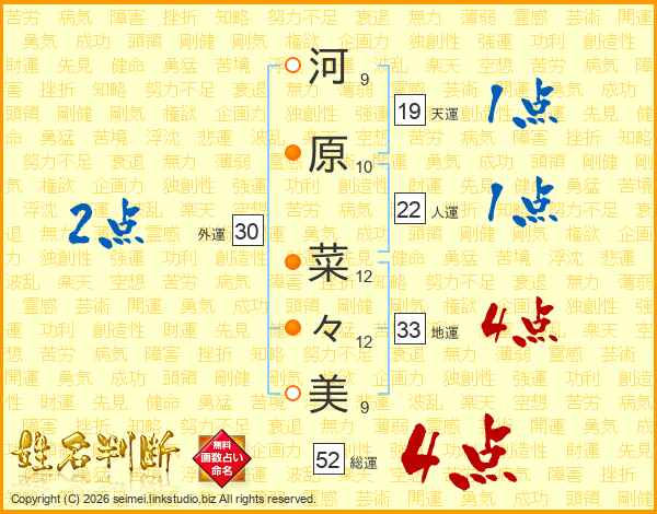 河(9画)原(10画) 菜(12画)々(12画)美(9画)