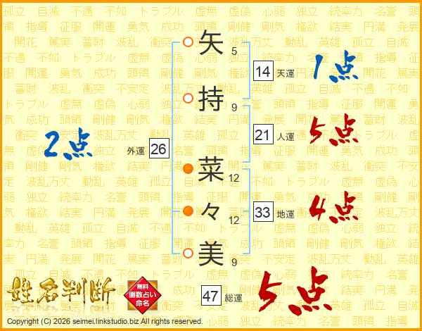 矢(5画)持(9画) 菜(12画)々(12画)美(9画)