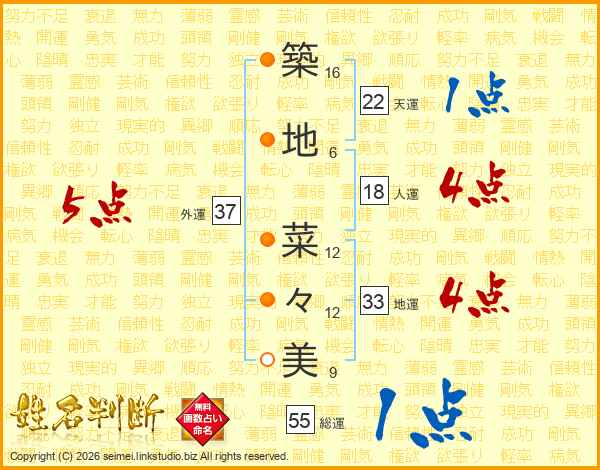 築(16画)地(6画) 菜(12画)々(12画)美(9画)