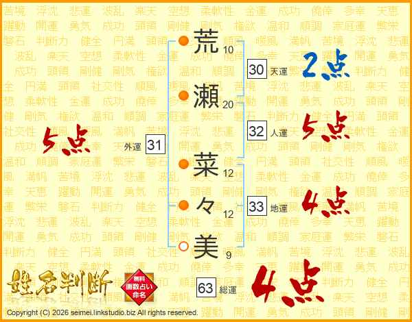 荒(10画)瀬(20画) 菜(12画)々(12画)美(9画)