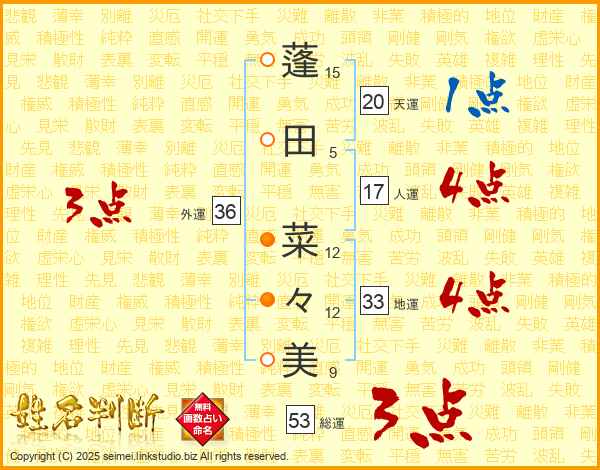 蓬(15画)田(5画) 菜(12画)々(12画)美(9画)