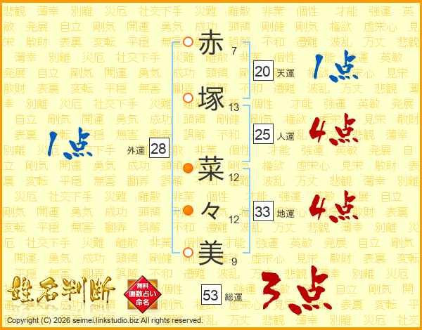 赤(7画)塚(13画) 菜(12画)々(12画)美(9画)