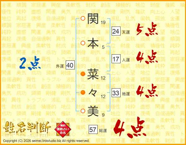 関(19画)本(5画) 菜(12画)々(12画)美(9画)