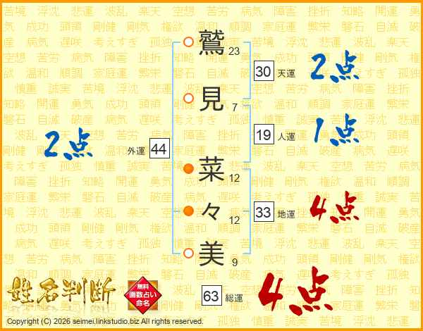 鷲(23画)見(7画) 菜(12画)々(12画)美(9画)