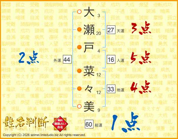 大(3画)瀬(20画)戸(4画) 菜(12画)々(12画)美(9画)