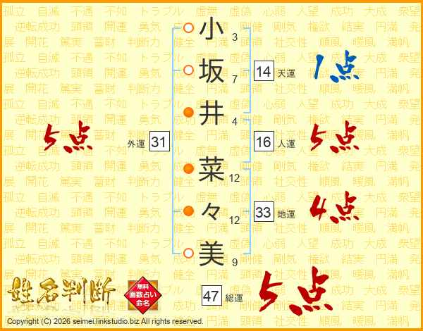 小(3画)坂(7画)井(4画) 菜(12画)々(12画)美(9画)