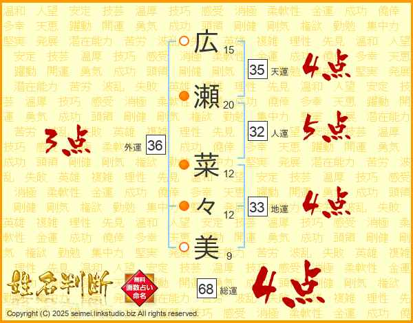広(15画)瀬(20画) 菜(12画)々(12画)美(9画)
