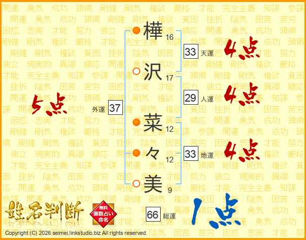 樺(16画)沢(17画) 菜(12画)々(12画)美(9画)