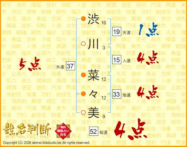 渋(16画)川(3画) 菜(12画)々(12画)美(9画)