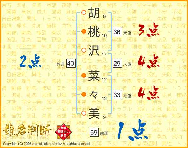 胡(9画)桃(10画)沢(17画) 菜(12画)々(12画)美(9画)
