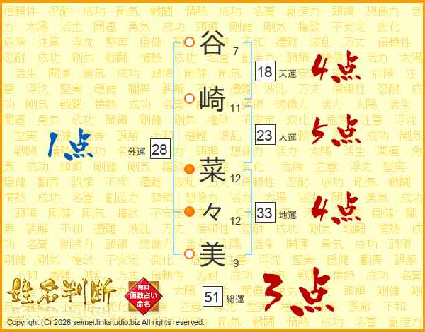 谷(7画)崎(11画) 菜(12画)々(12画)美(9画)